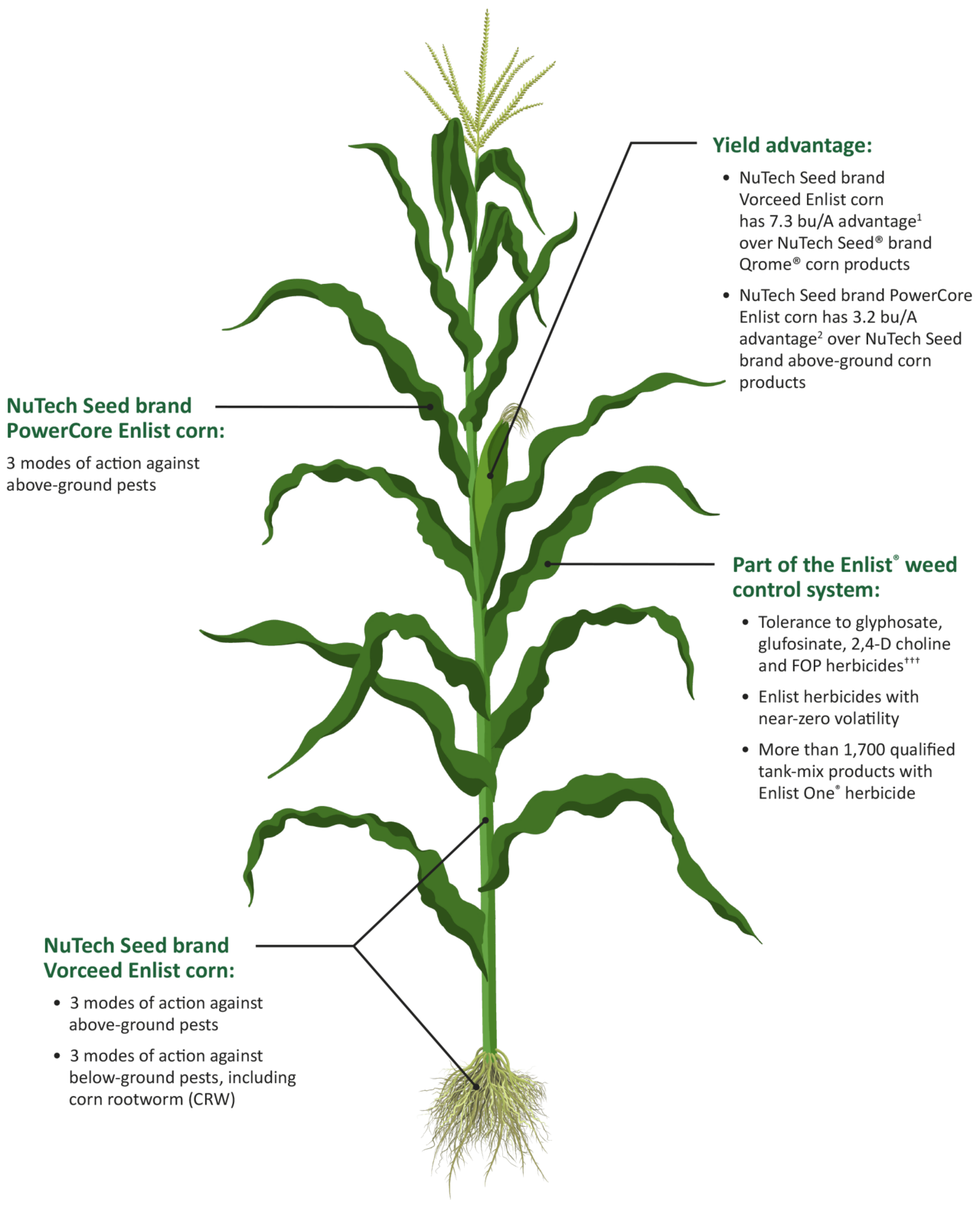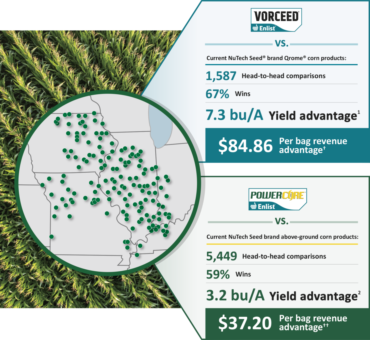 NuTech Seed brand Vorceed® Enlist® corn is proven to deliver a 7.3 bu/A yield advantage1 and $84.86† more per bag vs. the current NuTech Seed brand Qrome® corn products. And NuTech Seed brand PowerCore® Enlist® corn offers a 3.2 bu/A yield advantage2 with $37.20†† more per bag vs. the current NuTech Seed brand above-ground corn products.