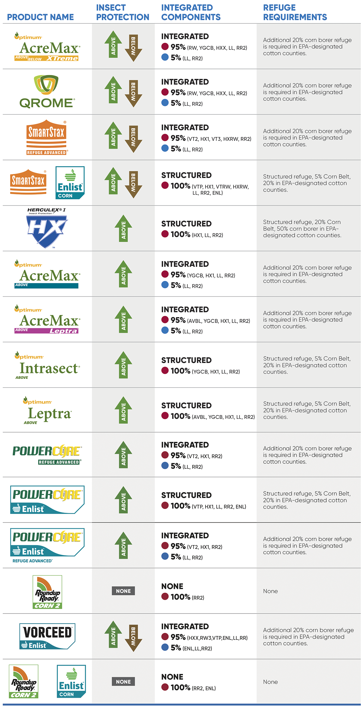Which products protect against corn earworm? Does your preferred seed have tolerance to Enlist® herbicides? What are the refuge requirements for PowerCore® hybrids?