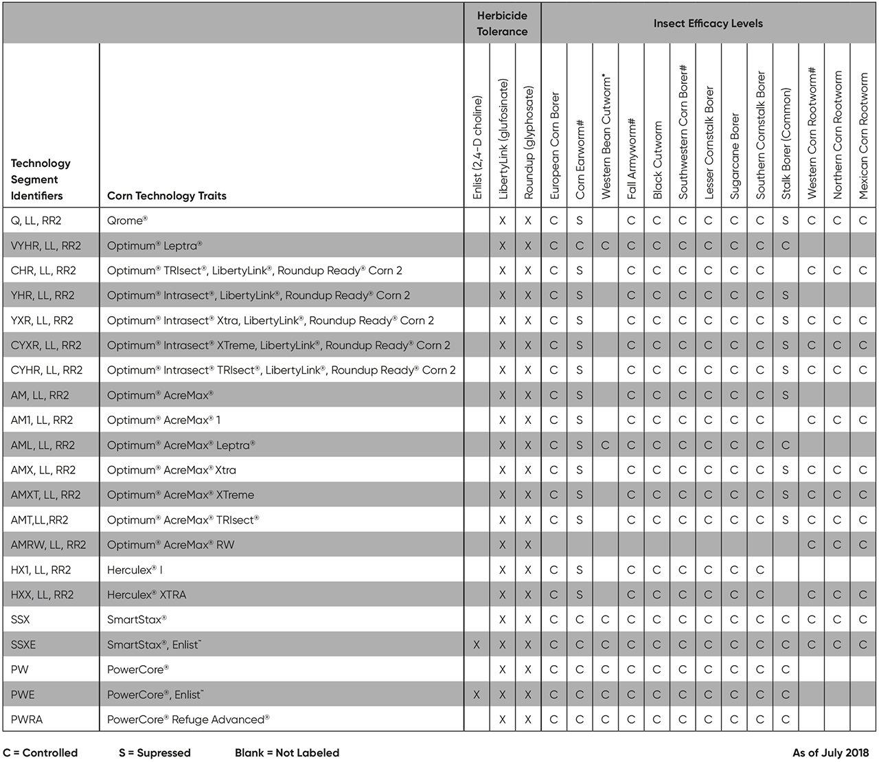 * Western bean cutworm has been removed from the product use statement for several corn products that contain Herculex® I (Cry1F) but lack another mode of action for western bean cutworm due to a wide-spread decrease in susceptibility indicating the possibility of field-evolved resistance to Cry1F in most geographies.