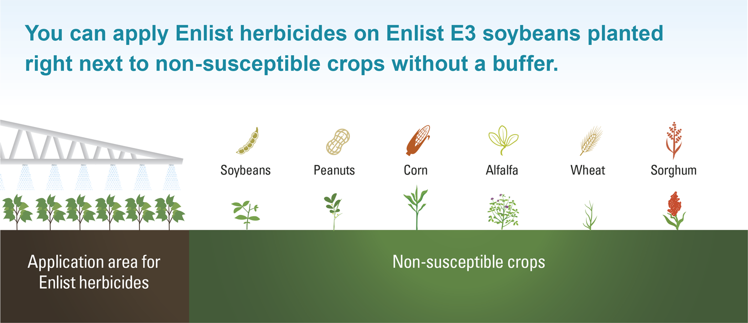 Following burndown, Enlist Duo® and Enlist One® herbicides with Colex-D® technology are the only herbicides containing 2,4-D that are authorized for preemergence and postemergence use with Enlist® crops. Consult Enlist® herbicide labels for weed species controlled. Enlist Duo and Enlist One herbicides are not registered for use or sale in all states and counties; are not registered in AK, CA, CT, HI, ID, MA, ME, MT, NH, NV, OR, RI, UT, VT, WA and WY; and have additional subcounty restrictions in AL, GA, TN and TX, while existing county restrictions still remain in FL. All users must check “Bulletins Live! Two” no earlier than six months before using Enlist One or Enlist Duo. To obtain “Bulletins,” consult epa.gov/espp/, call 1-844-447-3813, or email ESPP@epa.gov. You must use the “Bulletin” valid for the month and state and county in which Enlist One or Enlist Duo are being applied. Contact your state pesticide regulatory agency if you have questions about the registration status of Enlist® herbicides in your area. ALWAYS READ AND FOLLOW PESTICIDE LABEL DIRECTIONS. IT IS A VIOLATION OF FEDERAL AND STATE LAW TO USE ANY PESTICIDE PRODUCT OTHER THAN IN ACCORDANCE WITH ITS LABELING. ONLY USE FORMULATIONS THAT ARE SPECIFICALLY LABELED FOR SUCH USE IN THE STATE OF APPLICATION. USE OF PESTICIDE PRODUCTS, INCLUDING, WITHOUT LIMITATION, 2,4-D-CONTAINING PRODUCTS NOT AUTHORIZED FOR USE WITH ENLIST CROPS, MAY RESULT IN OFF-TARGET DAMAGE TO SENSITIVE CROPS/AREAS AND/OR SUSCEPTIBLE PLANTS, IN ADDITION TO CIVIL AND/OR CRIMINAL PENALTIES. Additional product-specific stewardship requirements for Enlist crops, including the Enlist Product Use Guide, can be found at www.traitstewardship.com.